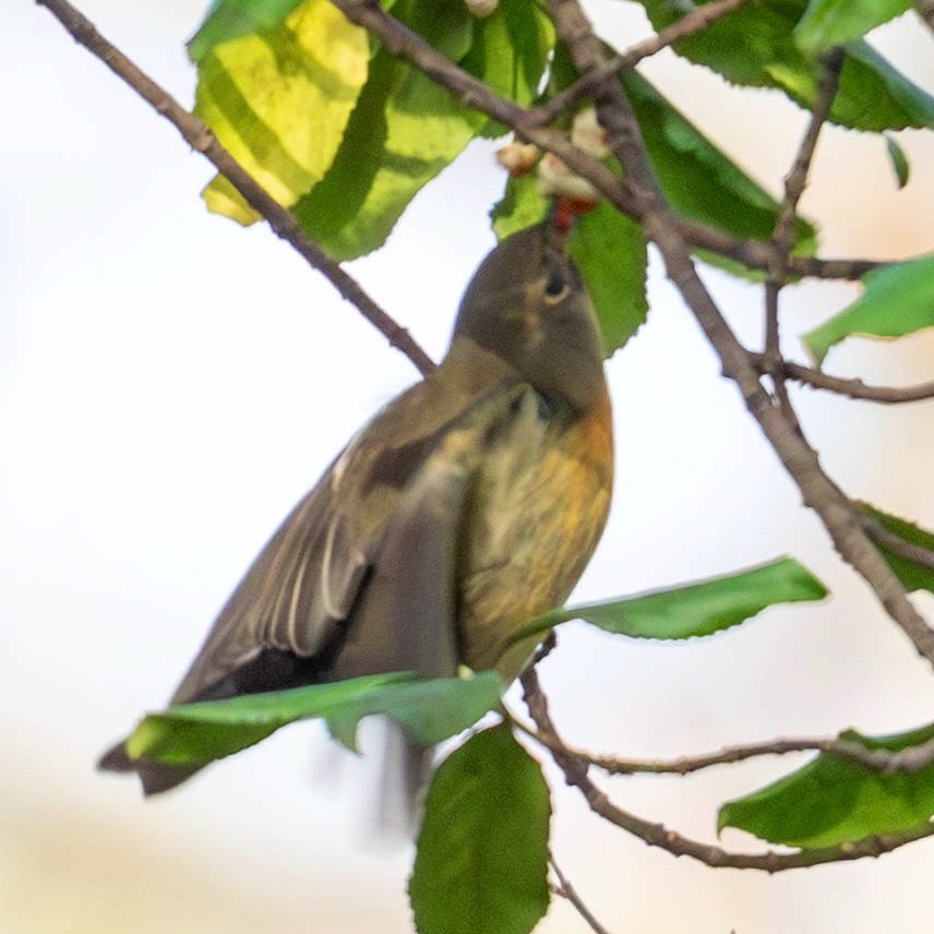 ムギマキちゃん。ツルマサキの実をパクッとしたところを撮ろうと思ったけど、ブレたー