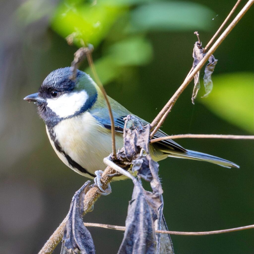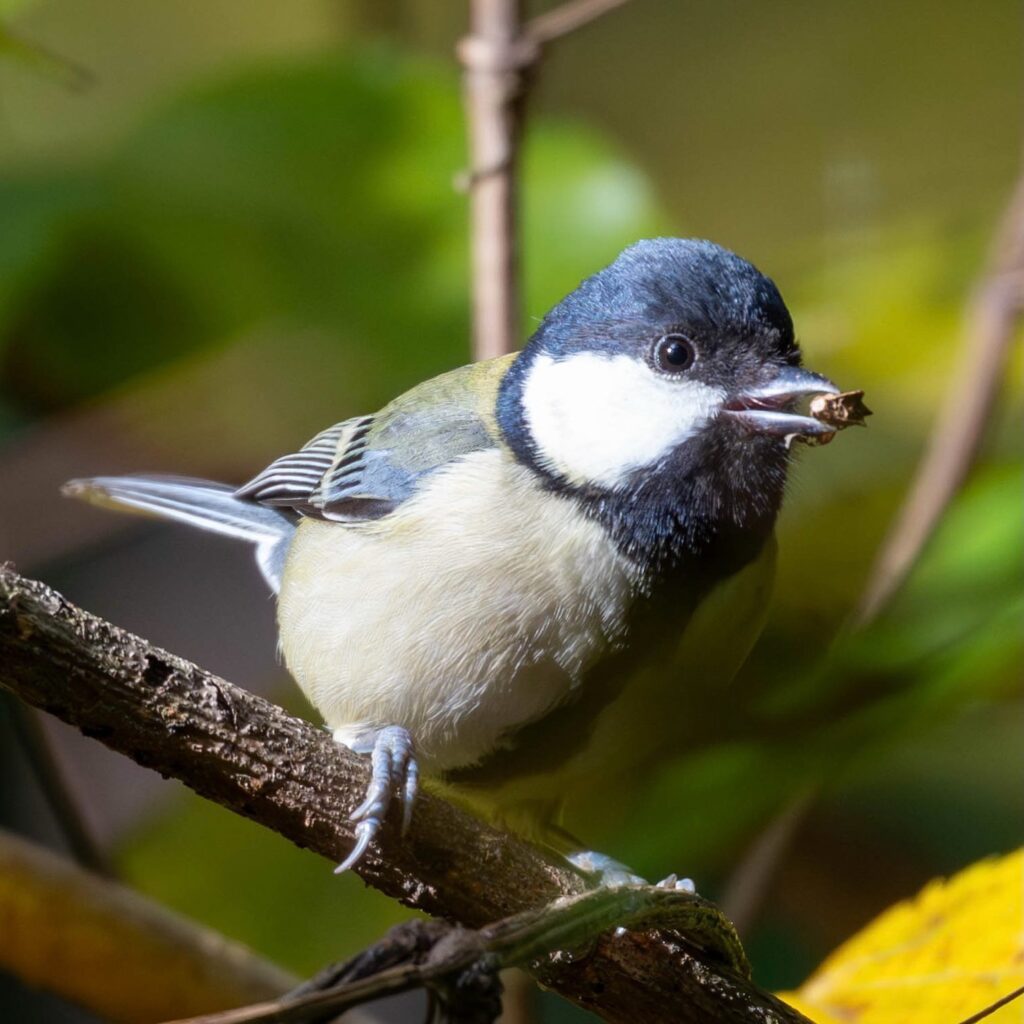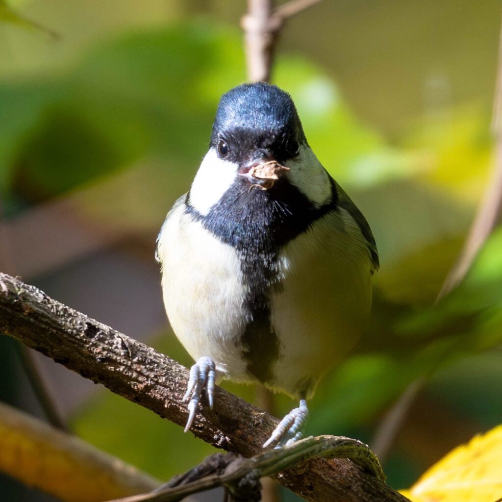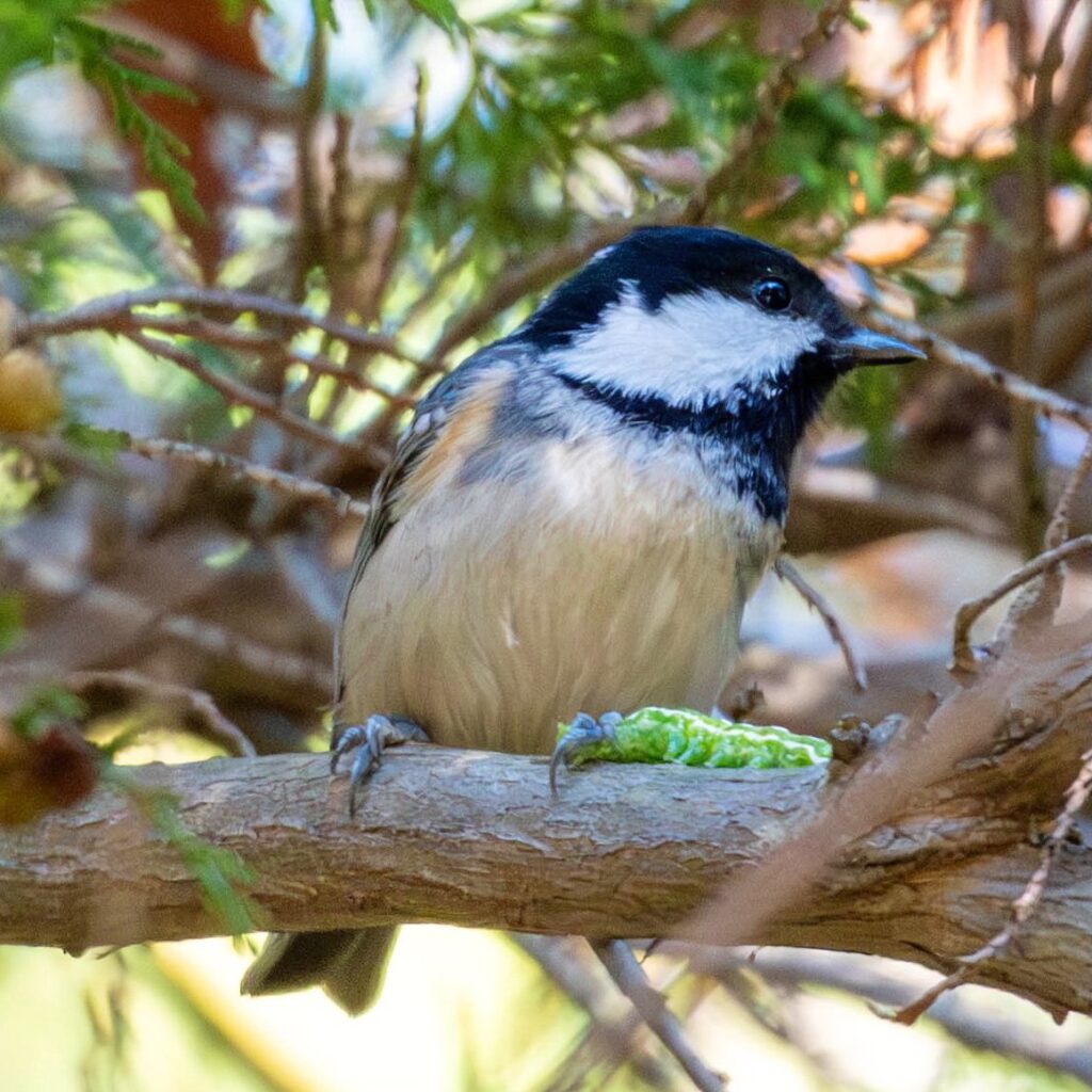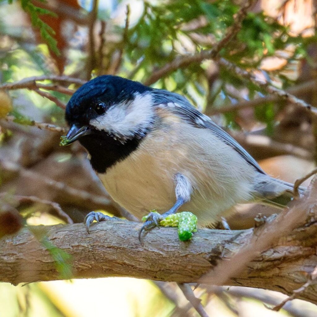 そして、なんと、混群にヒガラちゃんが混じっていました。ヒガラちゃんはでっかい青虫を食べてました。