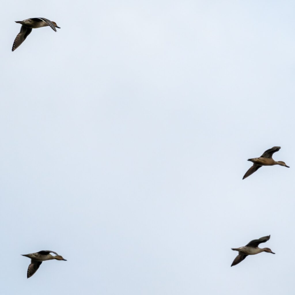 そして、トモエガモちゃん達が飛ぶー(オナガガモちゃんも一部混ざっています)