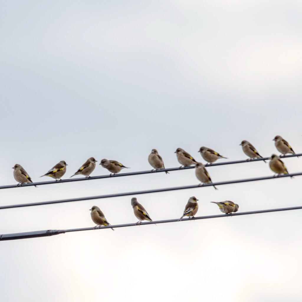 電線にはカワラヒワちゃんの群れ。カワラヒワちゃん達は畑の上を飛んでは電線に止まるを繰り返していました。