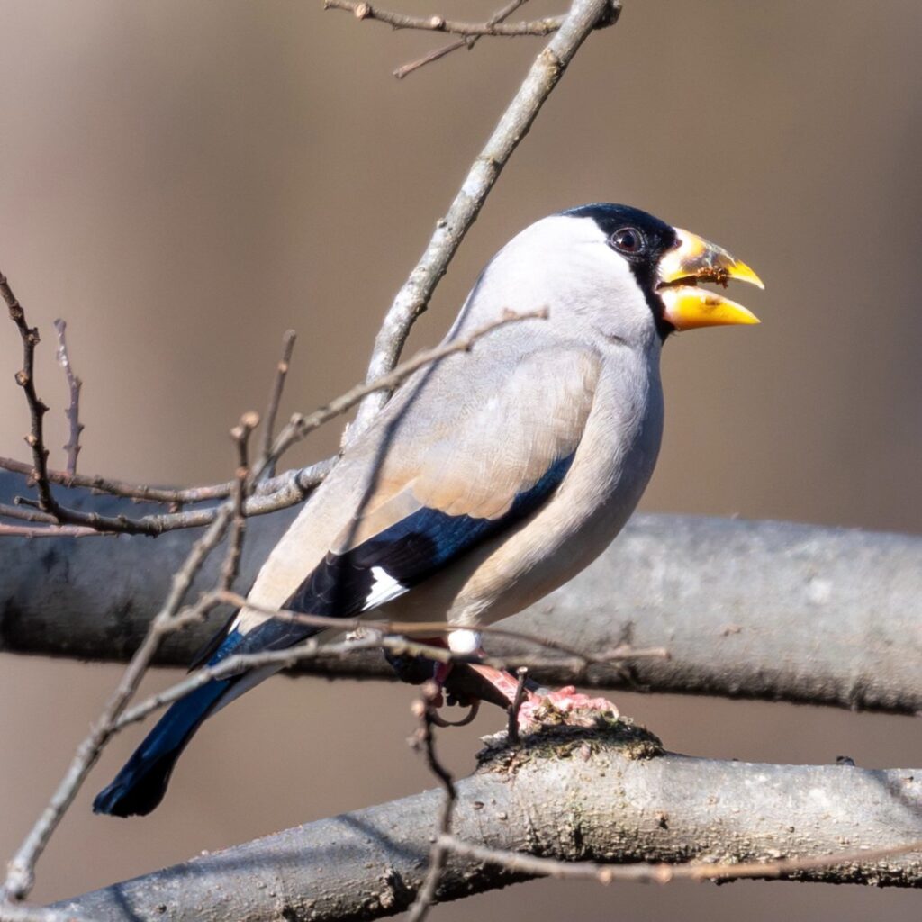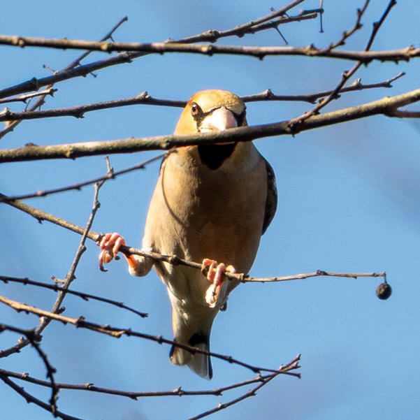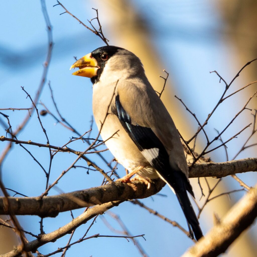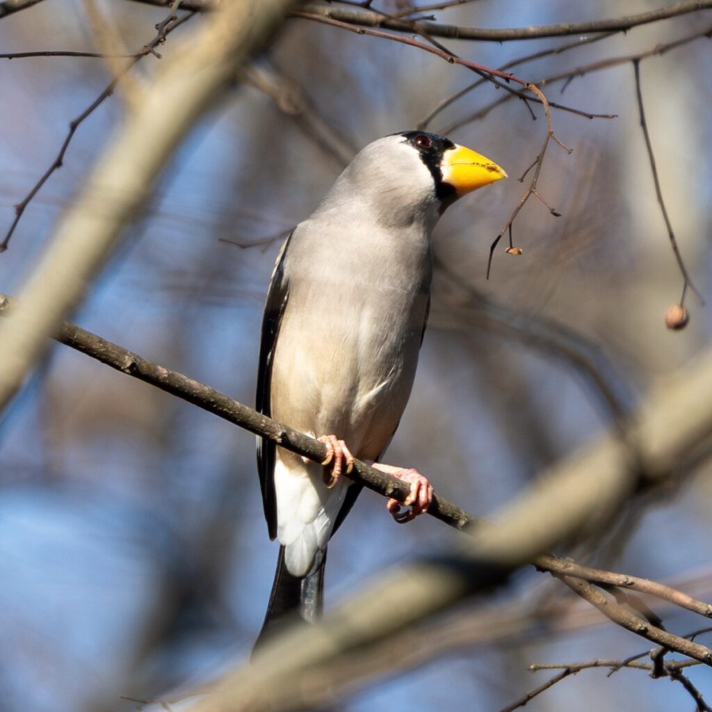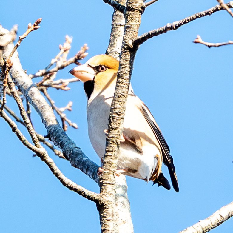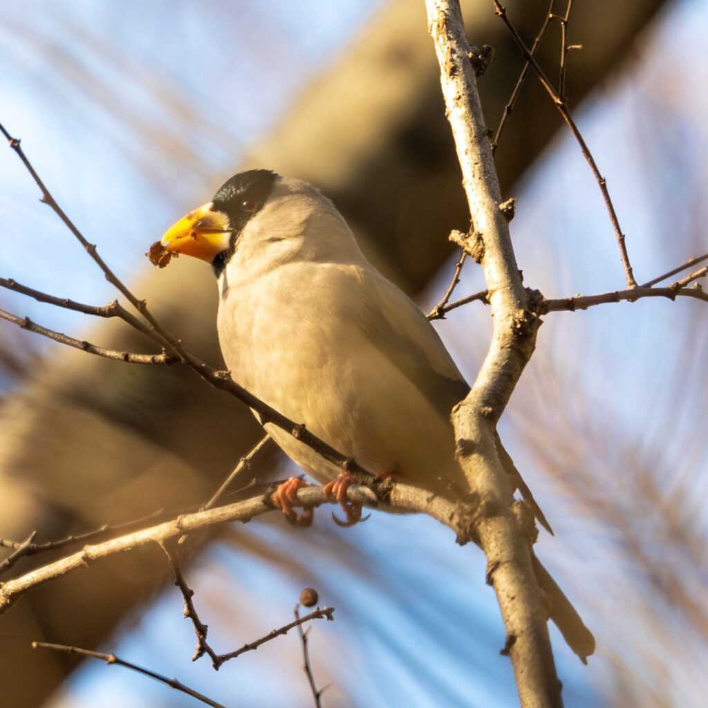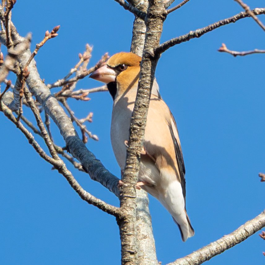 チチチという声が聞こえてきたので、周囲を見回すとシメちゃんが木の上の方に止まっていました。