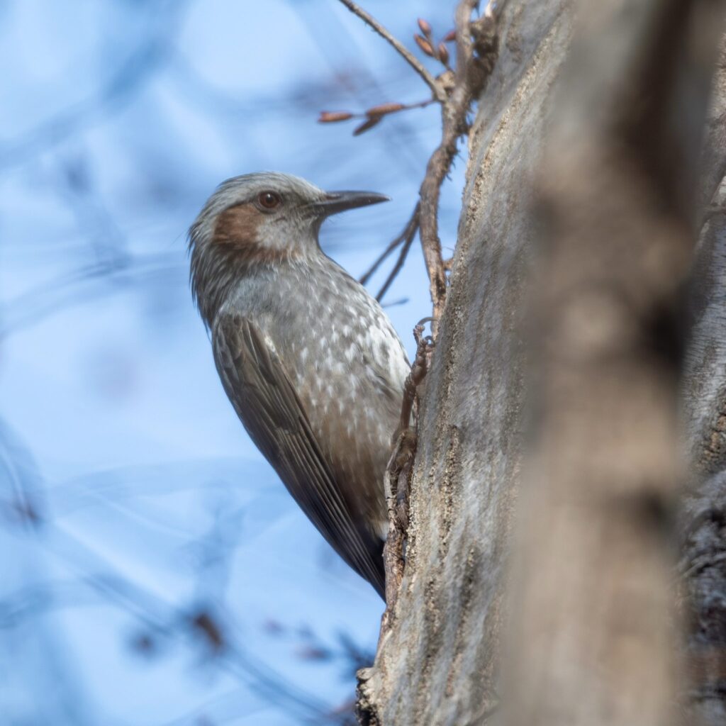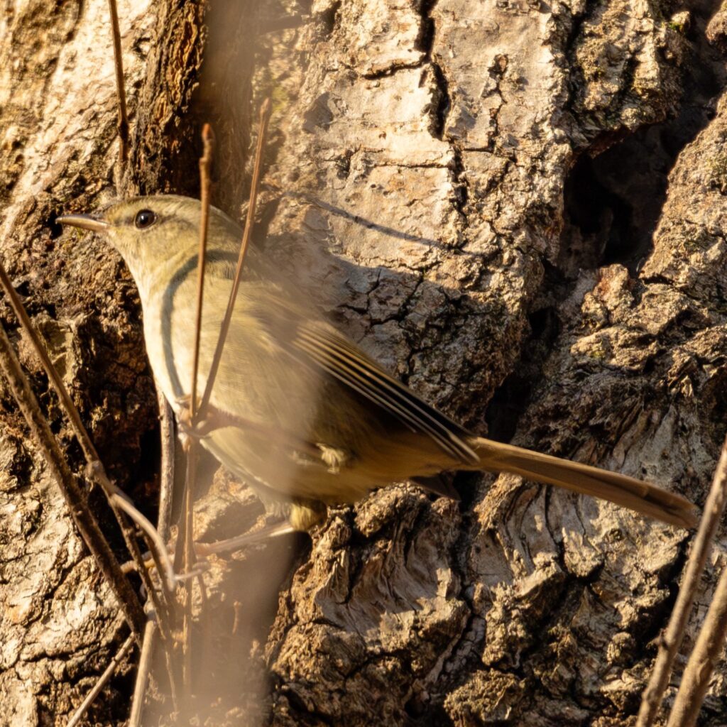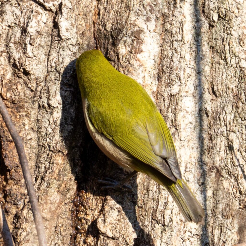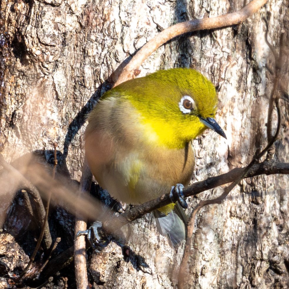 木道に行くと、メジロちゃんが木の幹に張り付いていました(木の蜜でも吸ってた??)