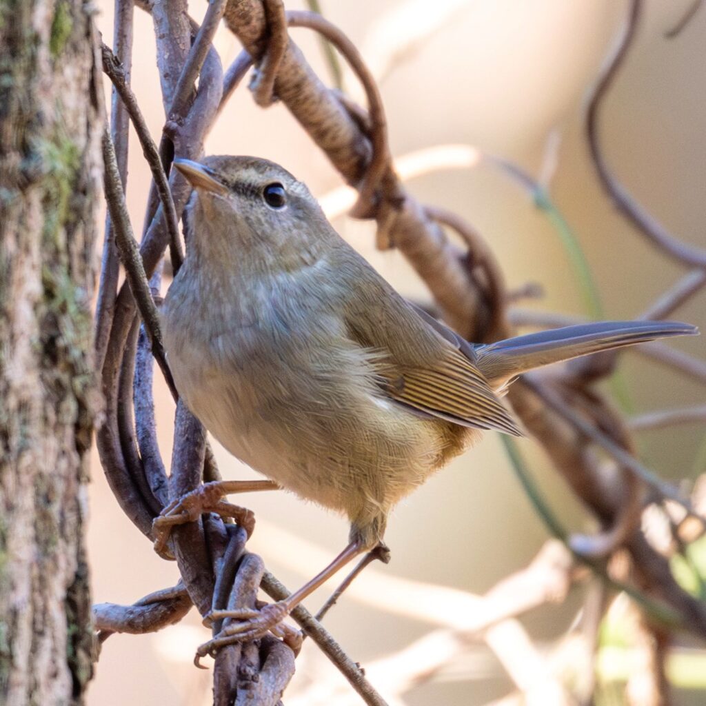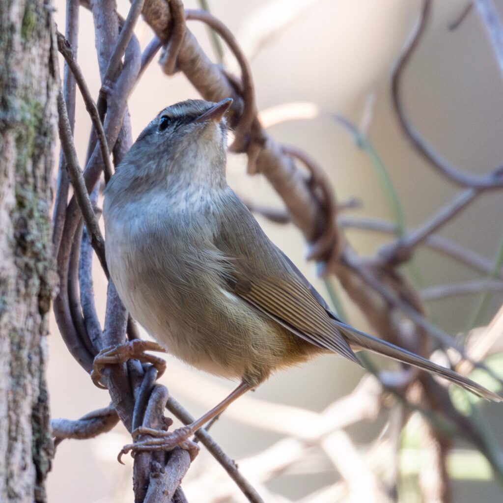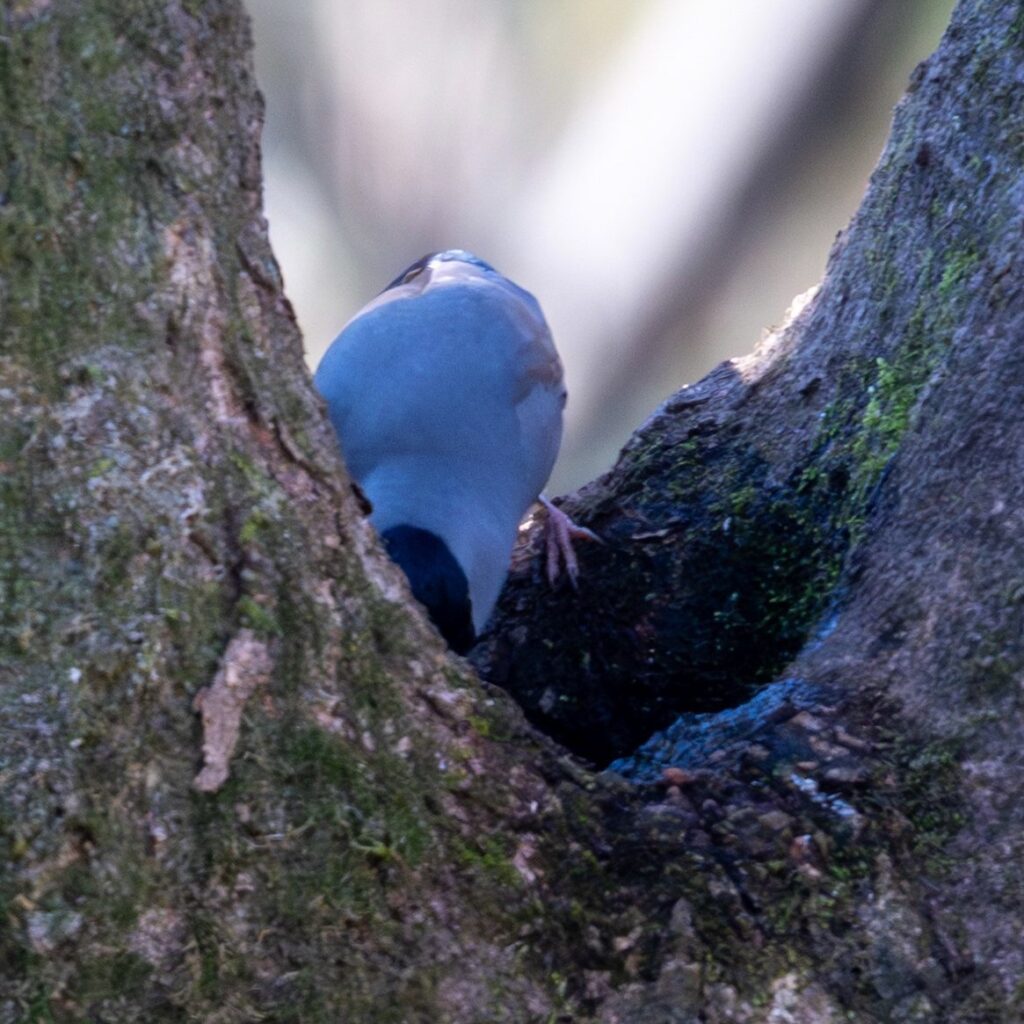 木道に行くと、メジロちゃんが木の幹に張り付いていました(木の蜜でも吸ってた??)