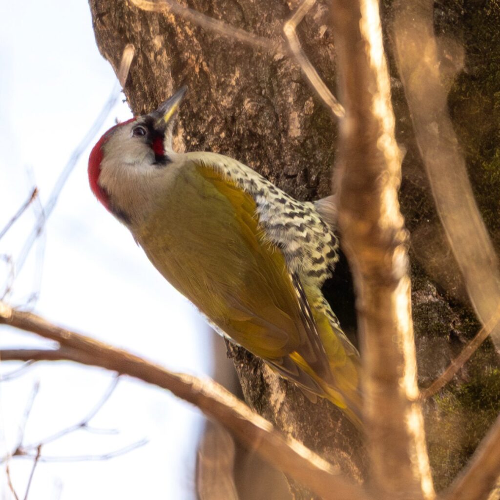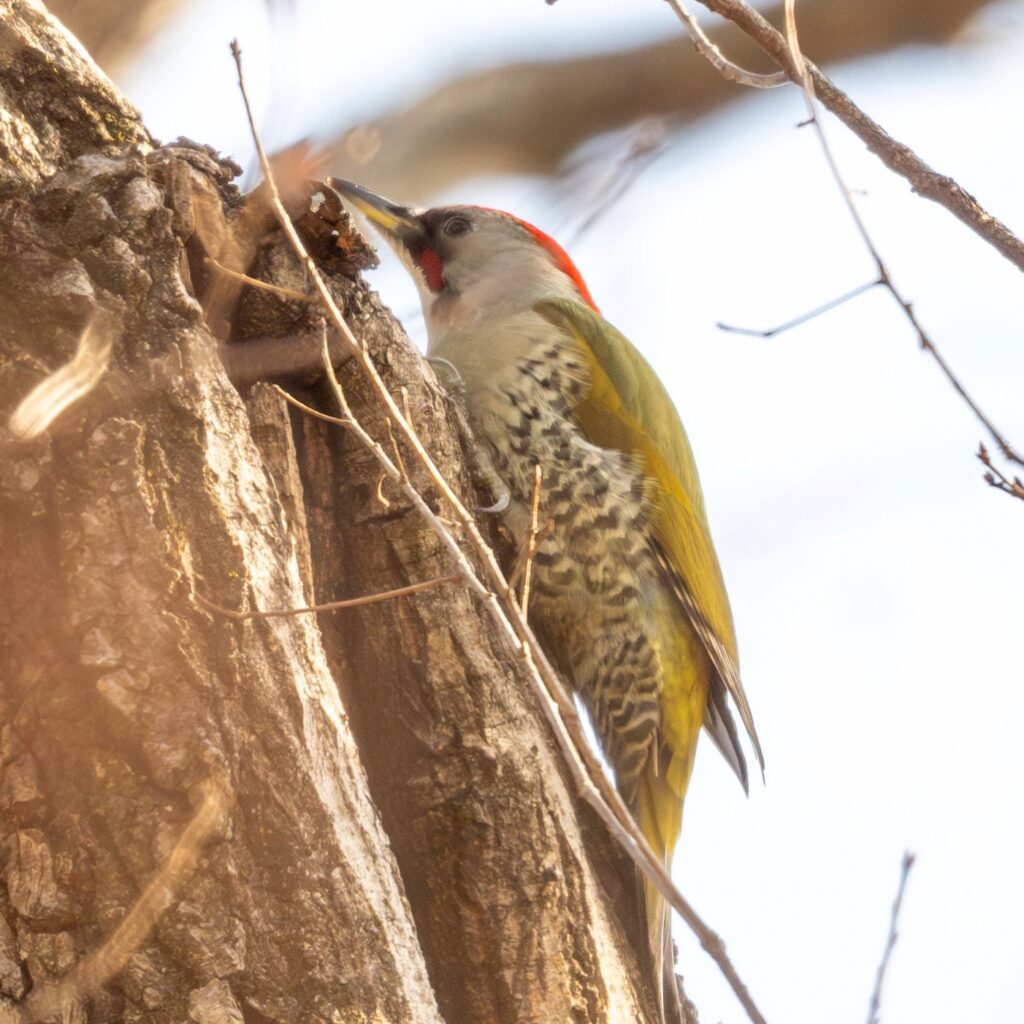 トラツグミが出てないかなーと木道を再び歩いてみますが、トラちゃんはお留守でした。もう一度、弁天池の方へ戻ると、アオゲラちゃんが木をつついていました。