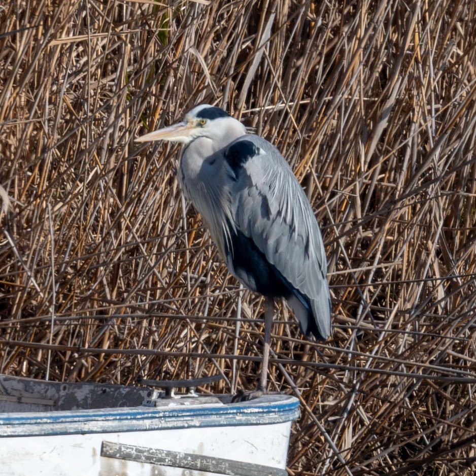 葦をバックにしれっと船のへりに立っていたアオサギさん