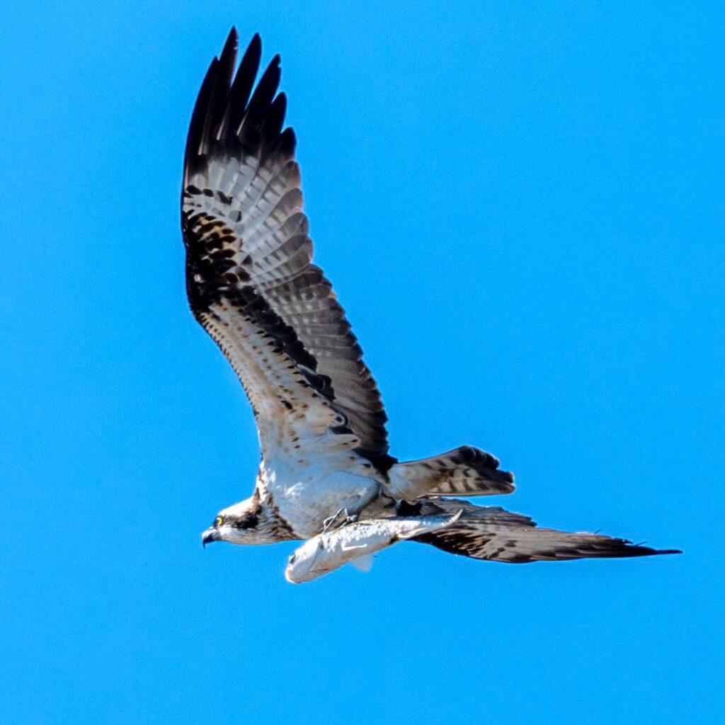 ミサゴが魚(ボラ??)を持って飛ぶ〜