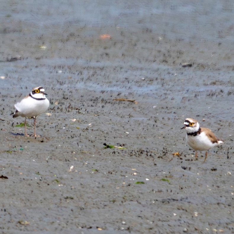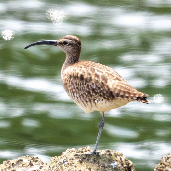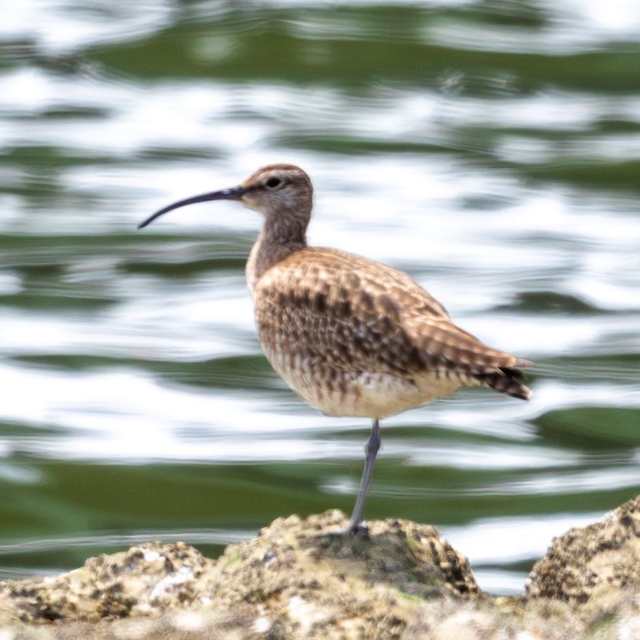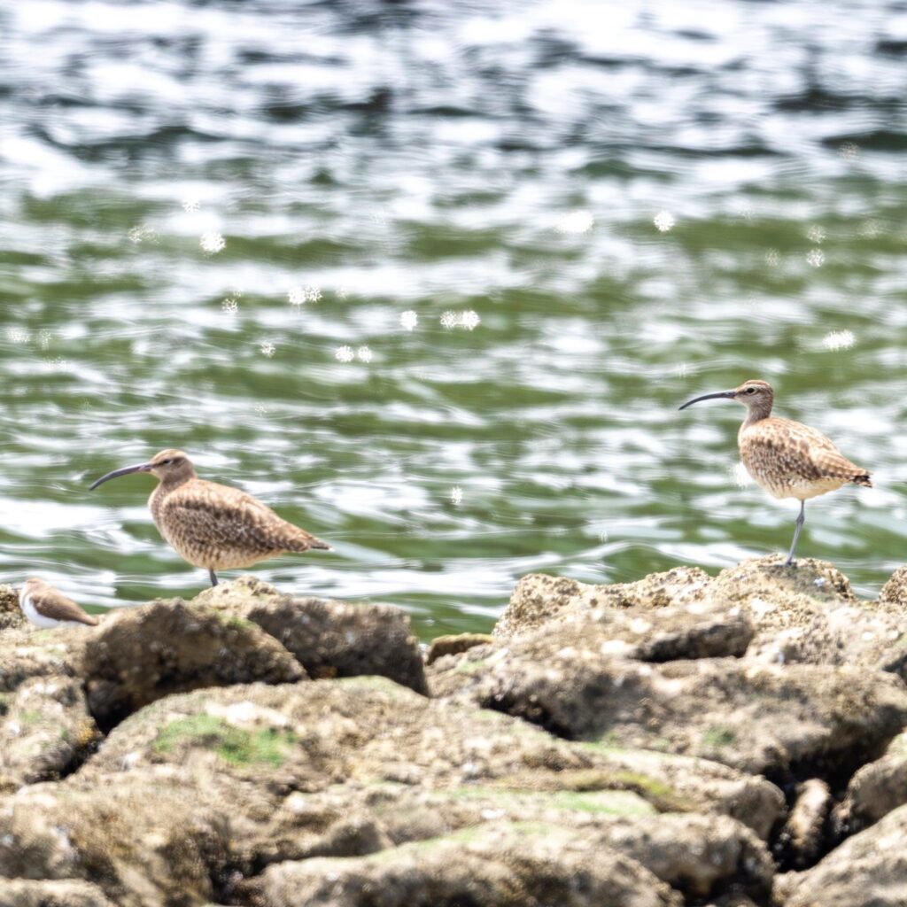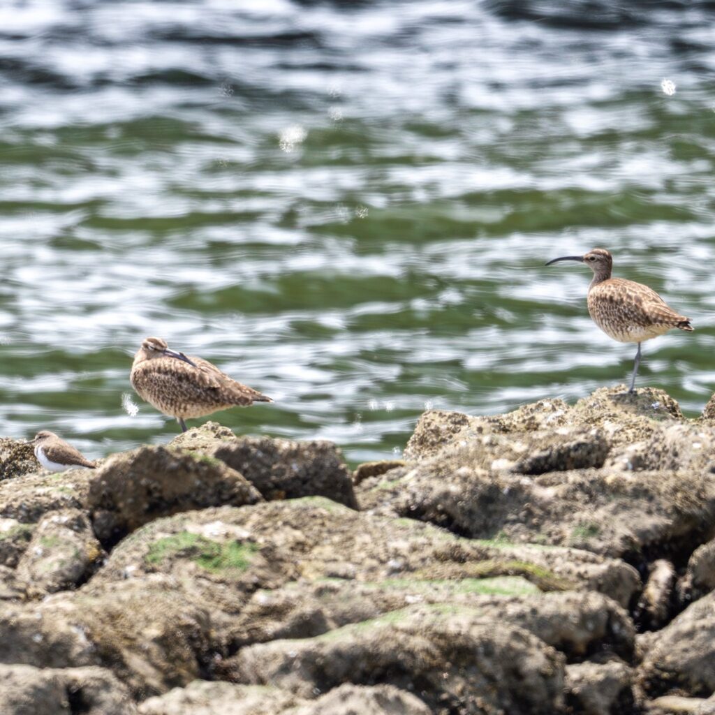 前浜干潟まで行くと、人だかりができていました。目を凝らすと、チュウシャクシギちゃんが2羽、岩の上に止まっていました。チュウシャクシギちゃんの足元にはイソシギちゃんもいました。