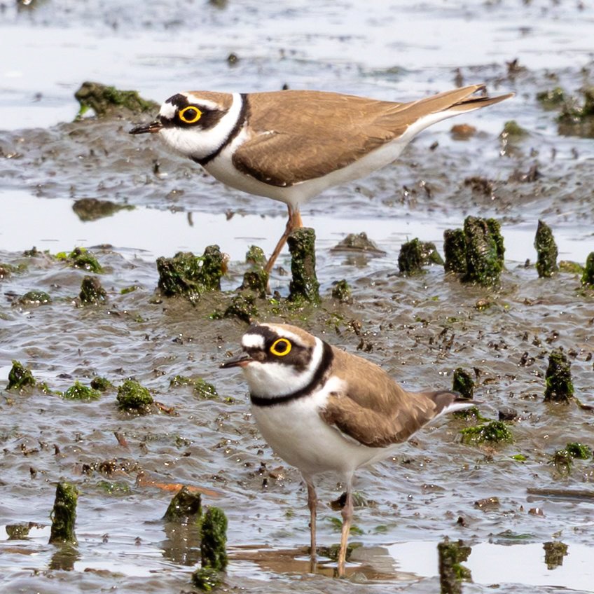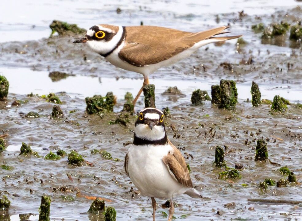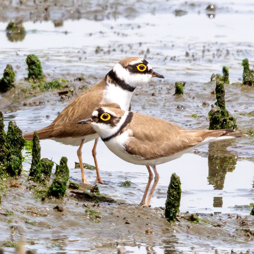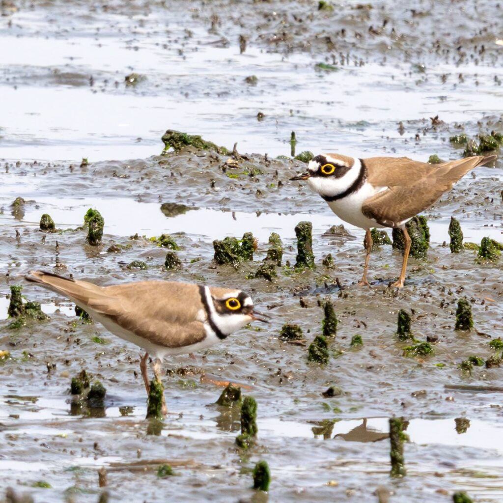 1号観察小屋から、2号観察小屋の前の干潟を覗いていると、オスのコッチーがメスに向けて猛アピールしていました(左がオス、右がメス)