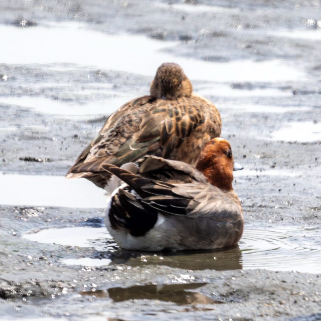 全然上手く撮れなかったのですが、ヒドリガモさんが干潟でお休み中でした。